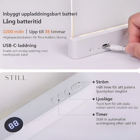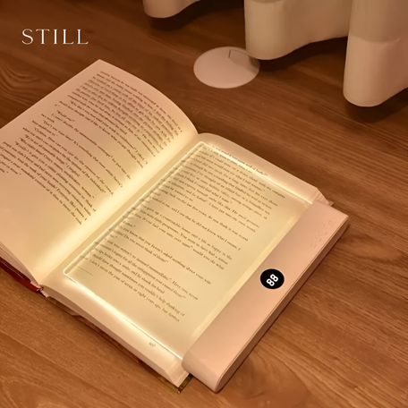 Den ger ett jämnt, riktat ljus över boksidan utan spilljus eller bländning, vilket gör det möjligt att läsa vidare utan att störa omgivningen.