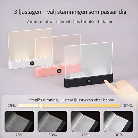 Den placeras direkt på boksidan och ger ett jämnt, riktat ljus över sidan.